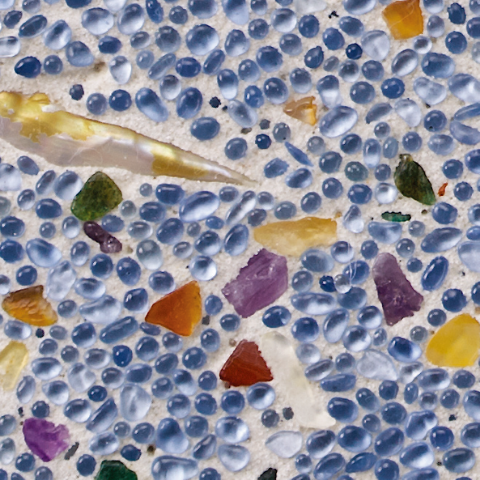 是以天然礦石,寶石和回收亮彩琉璃等素材組成的裝飾材料。並依據不同的裝飾顆粒配置特殊的有色粉體黏著劑組成。每個包裝桶含有打底劑,黏著劑跟顆粒。