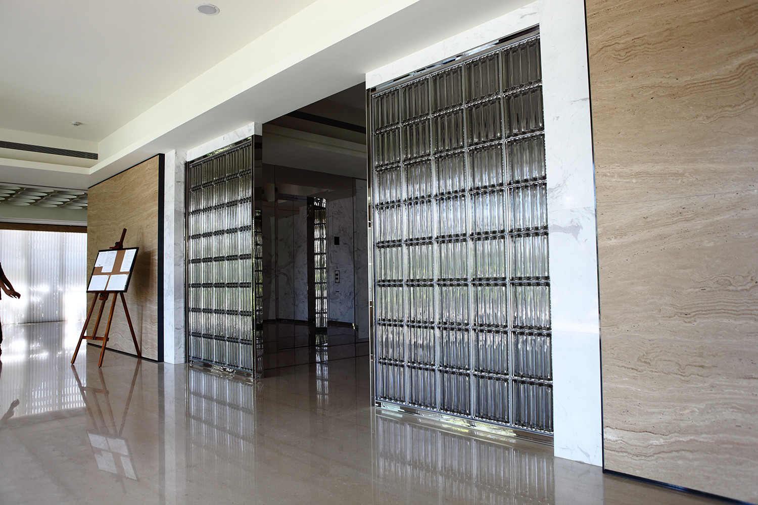 水晶玻璃在連續溝槽的光影折射下更顯晶透閃耀,突破傳統思維的美感呈現,使豪宅建案更添奢華和話題性。