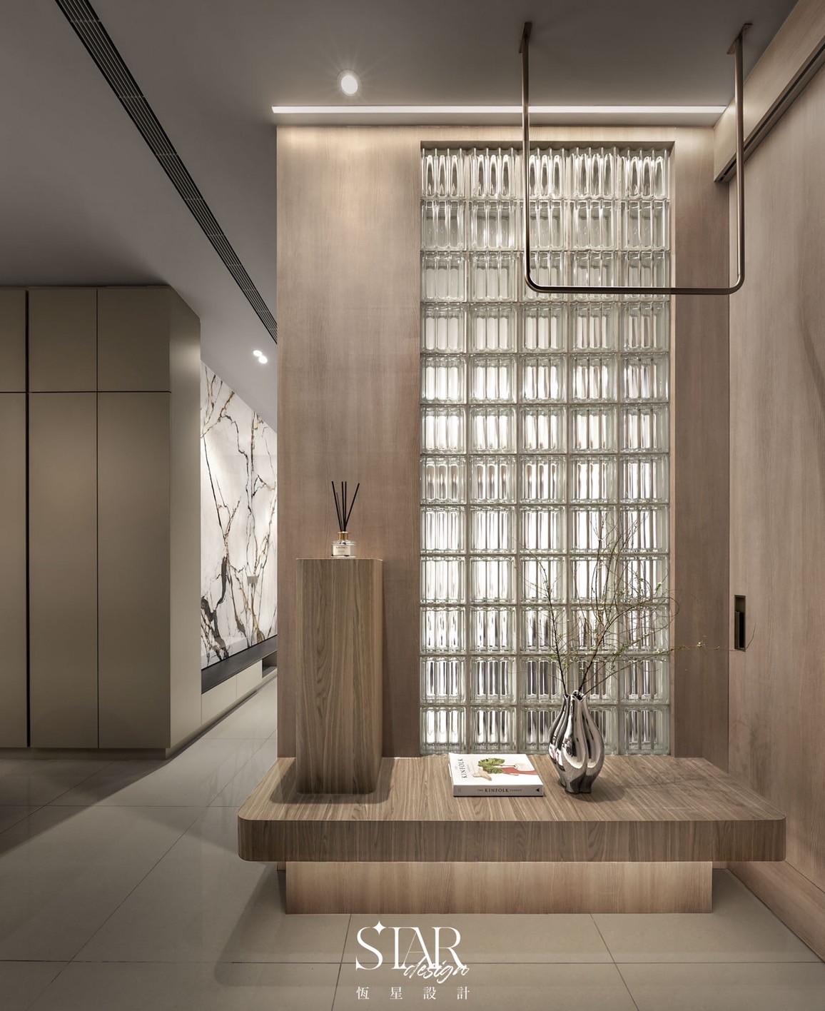 夜中透著溫暖光線的大理石肌理與流金線條,沉穩中難掩屋裡自然散發的輕奢氛圍