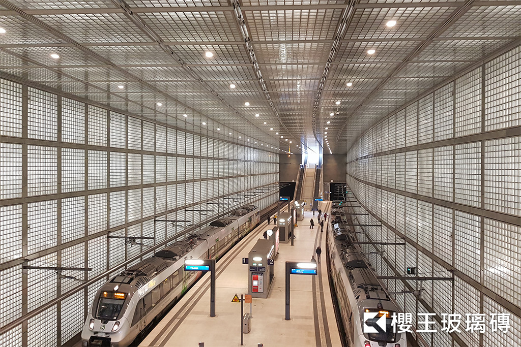 車站大廳位於地下20米處,為縱向略有彎曲的空間,細長而無柱的大廳從牆面至天花板都以玻璃磚呈現,玻璃磚預鑄於混凝土框架中構築而成,而月台與所有站內必要的設施則都以混凝土設計佈局,讓玻璃磚與混凝土在空間中安靜的對話,也是保留給人群、光影、時間三者之間的交流空間。