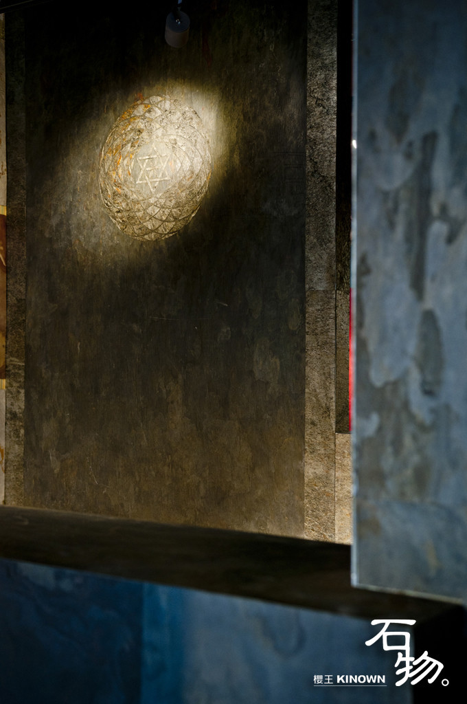 將原先雷雕花石片,與另一塊石材貼合,投射燈打入,Logo隨即如浮雕般顯現,創造出特殊的視覺設計,平凡石物也被點亮新生命。